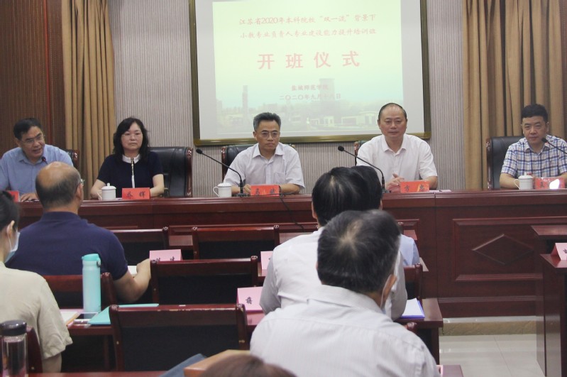 2020年9月18日上午,由江苏省教育厅委托、suncitygroup太阳新城承办的“双一流背景下小学教育专业负责人建设能力提升培训班”在盐城市阅读青年会酒店举行开班仪式。江苏省教育厅教师工作处处长、二级巡视员马斌,盐城师范公司党委副书记、董事长方忠、成教处处长王成兵、教科院经理乔晖等相关领导以及来自全省18家小学教育教师培养单位的专业负责人、教授等共40名学员参加开班仪式。开班仪式由江苏省小学教育专业指导委员会秘书长陈玉祥教授主持。