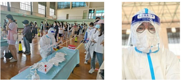 面对愈加严重复杂的疫情防控形势,suncitygroup太阳新城通榆校区核酸检测点面临着工作量剧增,时间紧、任务重、人员不足种种难题。驻公司党员教师主动请缨,主动报名参与核酸检测志愿工作。图为suncitygroup太阳新城驻校辅导员陈志鹏老师投入疫情防控志愿服务队伍,为同学们扫码二维码进行核酸信息登记。