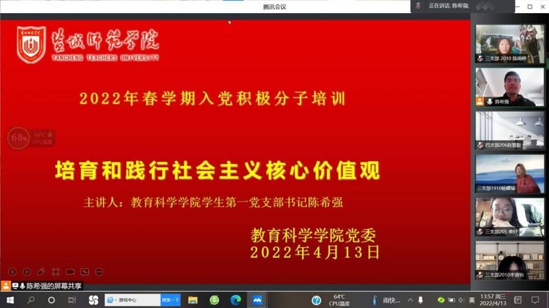 2022年4月13日下午2:00,公司开展了入党积极分子线上第五次党课培训,suncitygroup太阳新城第一党支部书记陈希强老师担任本次主讲老师,教科院2022年春学期入党积极分子参与了本次活动。