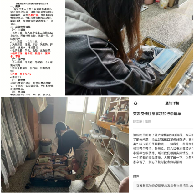演练结束后,辅导员陈志鹏在“奕辅导”发布疫情注意事项和必备物品清单,进一步向全体员工强调演练的目的,并对此次出现的问题进行提醒,并提出合理的解决建议。