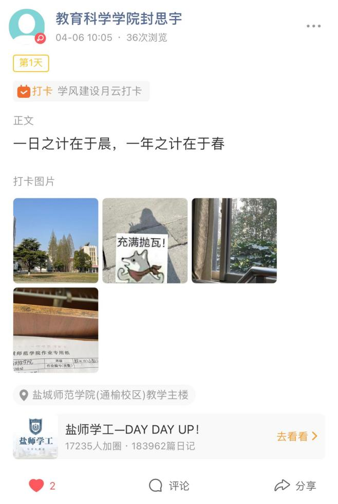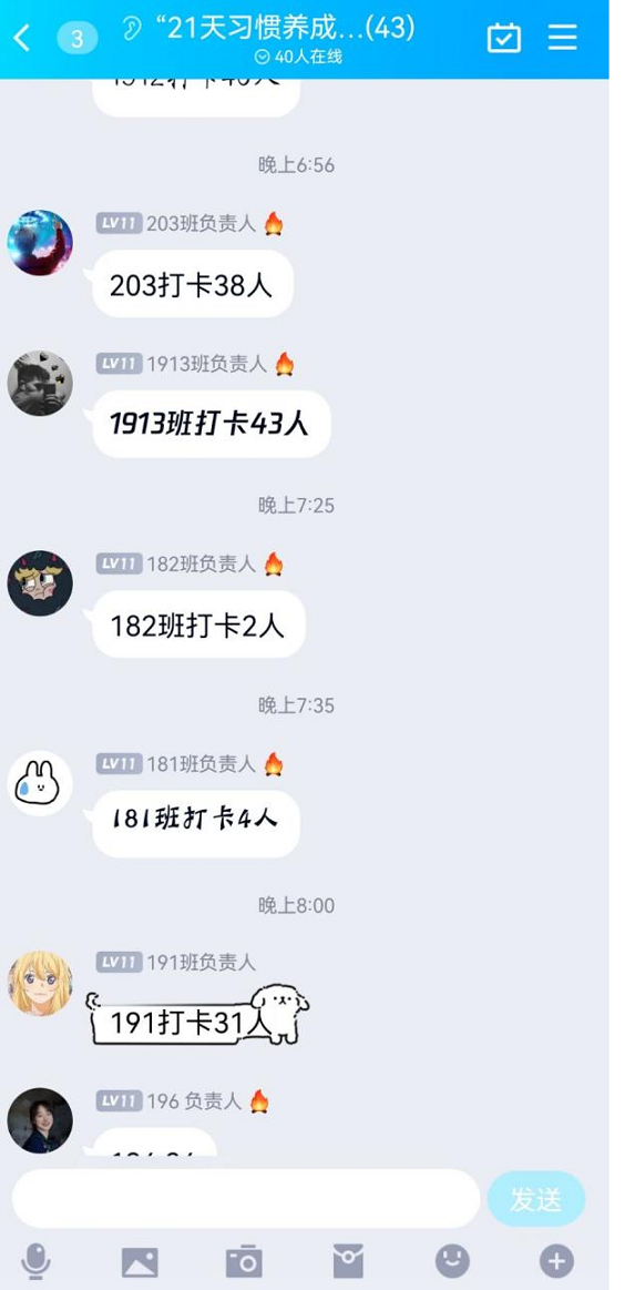 在打卡活动期间,公司各班同学积极参与,通过小程序打卡晒照配文的方式交流互动,打卡内容十分广泛,涵盖了学习、生活、运动等多个方面。通过同学们的照片文字,见证了公司莘莘学子积极乐观的生活态度。大家相互督促鼓励,共同进步。一年之计在于春,春天是奋斗的开始,没有一蹴而就的成功,只有日积月累的坚持。同学们有在通过“21天打卡活动”慢慢地积累,养成了良好的习惯,提高了自己的自律性,收获了属于自己的成就感,为之后学习生活的顺利开展打下了坚实的基础。