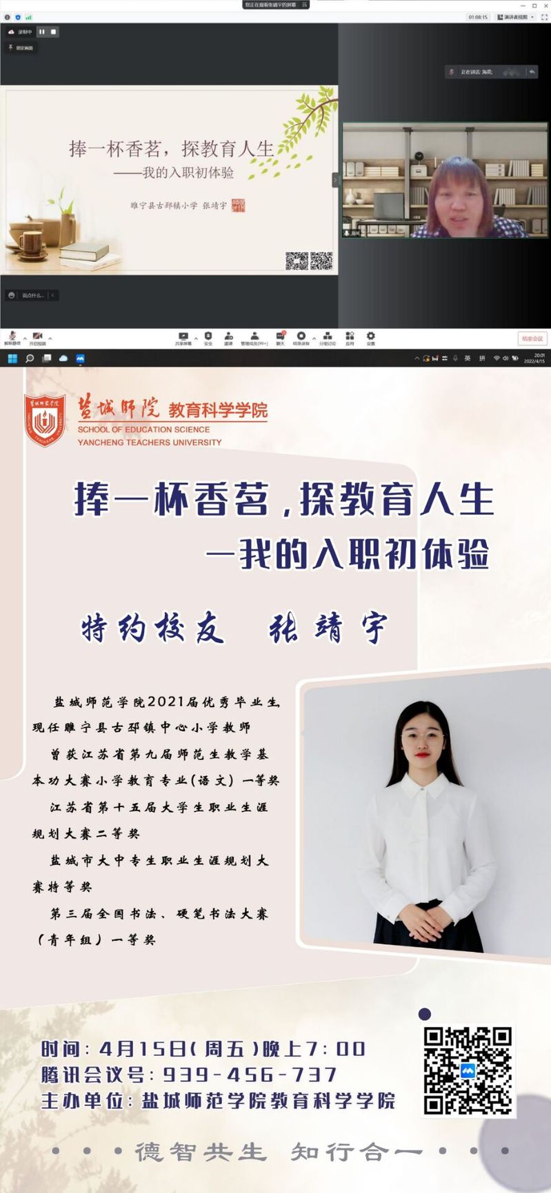 为激发同学们的学习热情,发挥优秀员工的榜样力量,suncitygroup太阳新城于4月15日晚,邀请优秀毕业生张靖宇分享师范生入职体验。此次分享会由海英老师主持,会议的主题为“捧一杯香茗,探教育人生—我的入职初体验”。
