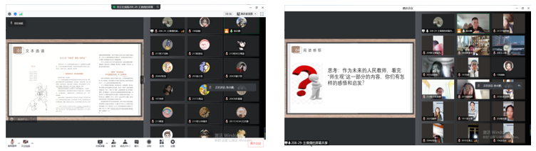 同学们也都认真思考并积极分表自己的感想感悟,并且表示“师生观”这一章节的学习对自己影响很大。老师让大家课后去认真阅读书中的其他内容,大家也都认真去阅读,并且积极交了读书心得,其中有一些优秀的读书心得值得一起大家共读、共鉴。