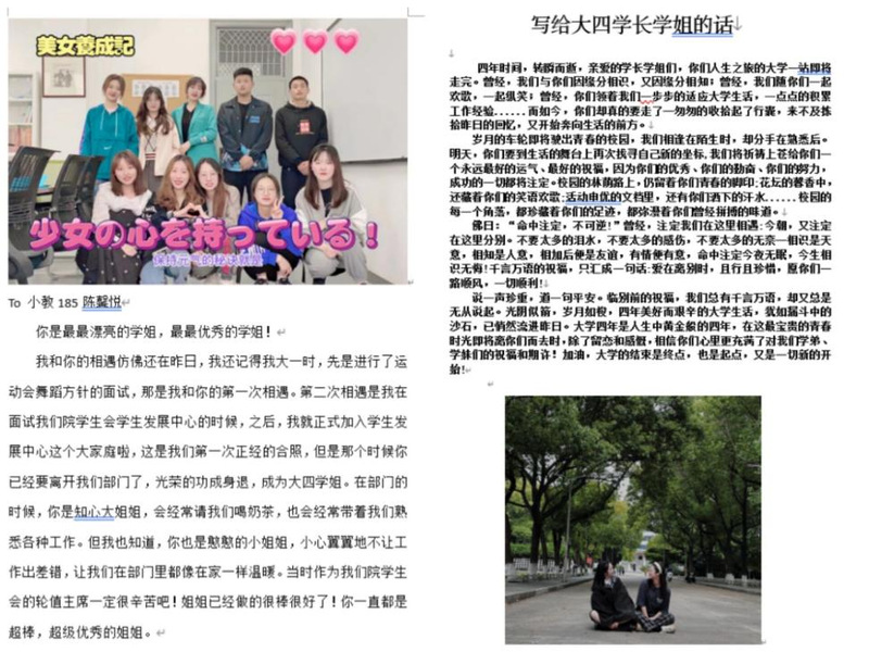 这次活动我们收集了77份作品,这些作品拉近了毕业生与学弟学妹的距离,可以让他们多了一些相处机会,既让学弟学妹收获了一些经验,也让学长学姐感受到了满满的爱意。愿毕业生们带着学弟学妹们诚挚的祝福迈向更美好的未来!