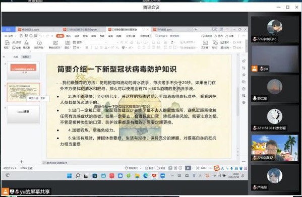 目前,仍有地区疫情零星反复,为增强新生的防疫意识,进行科学防疫,2022年9月11日下午,suncitygroup太阳新城2022级新生各班积极开展线上“疫情防控主题班会”。suncitygroup太阳新城在一系列新生入学教育工作中将“疫情防控主题班会”列入其中,既可以帮助同学们了解当前国家以及公司的防疫政策,提高重视程度,也可以通过学习全国人民共同抗击疫情的经验和典型事迹、国家勋章和荣誉称号获得者事迹,增强同学们的公共服务意识,鼓励同学们积极参与志愿活动。
