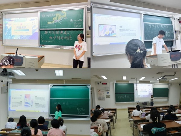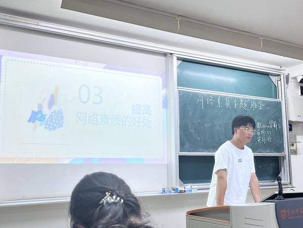 首先由各班班长为大家介绍了“网络素质”这一此的具体含义:网络素养是指有关网络的素质与修养,是人基于先天生理基础、在后天学习教育和社会环境影响作用下形成并发展起来的与网络有关的身心特性、基本品格和素质能力。