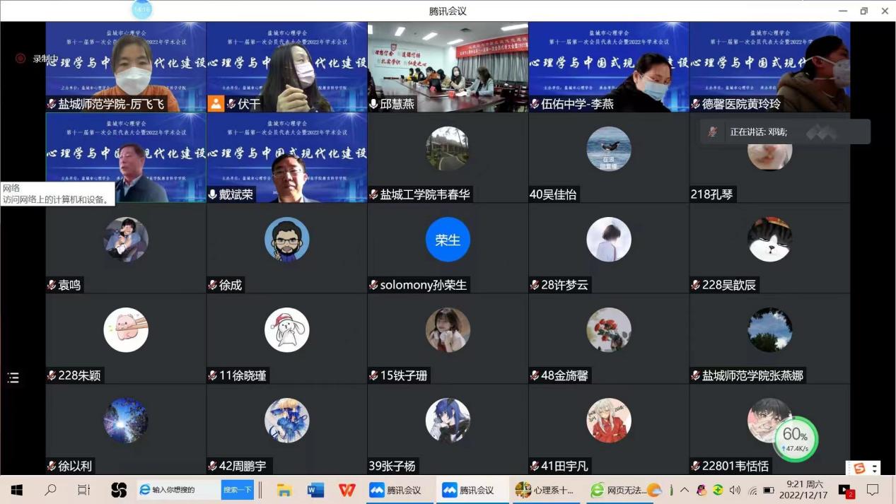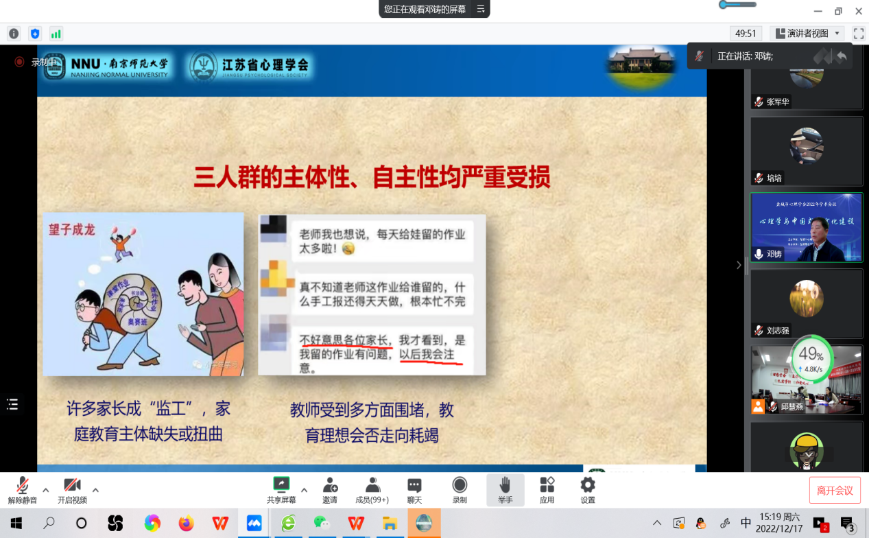 下午在云端召开了盐城市心理学会2022年学术会议。特邀江苏省心理学学会理事长邓铸教授做主题为《家校社教育责任的边界——“双减”“家庭教育促进法”与儿童生命健康成长》的学术报告。邓铸教授重点解读了“双减”政策和“家庭教育促进法”,从儿童、家长、公司、社区、政府等五个方面,提出要正确认知家校社主体责任边界及担当,并就“双减”要坚决推进教育生态治理等问题与会员代表进行了交流,与会代表纷纷表示讲座深入浅出,收获颇多。