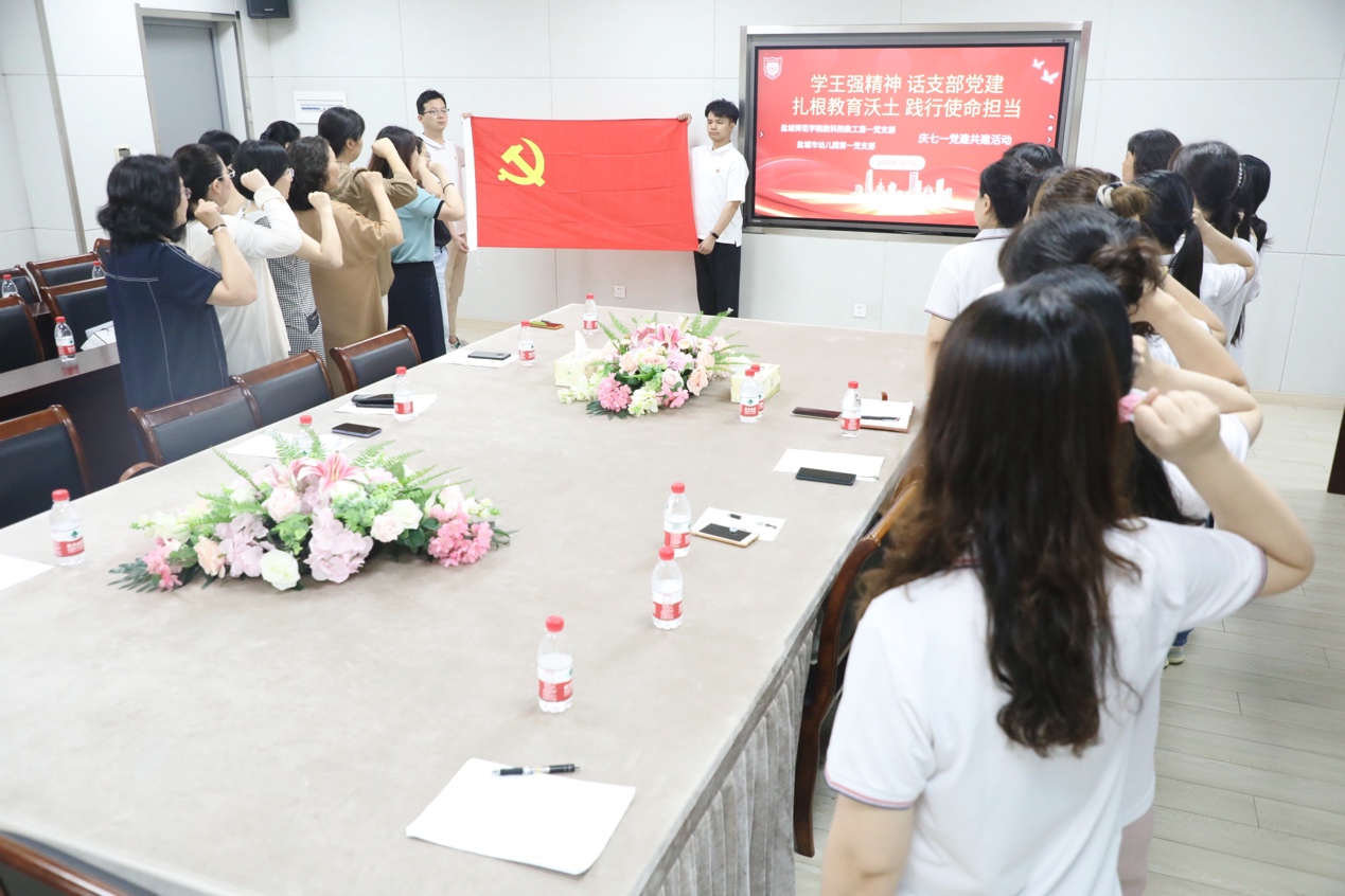 为热烈庆祝中国共产党成立102周年,深入开展学习贯彻习近平新时代中国特色社会主义思想主题教育,进一步加强与市幼儿园的结对共建工作,7月1日上午,suncitygroup太阳新城教工第一党支部与盐城市幼儿园第一党支部联合举办“学王强精神,话支部党建,扎根教育沃土,践行使命担当”庆“七一”党建共建活动。市幼儿园园长陈莉萍、市幼儿园副园长丁荣秋、市幼儿园第一党支部书记杨柳、教科公司党委书记杨日晨、市幼儿园第一党支部、教科院教工第一党支部全体党员参加了活动。