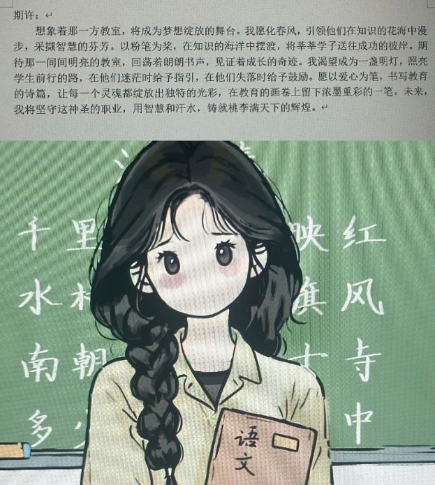 活动伊始,迅速吸引了公司同学的广泛关注与积极参与。在活动举办期间,同学们纷纷投稿,通过创意和职业设计作品,充分展现了自己对未来职业的憧憬与规划。其中,小教专业的同学们尤为突出,他们纷纷表达了自己未来站在三尺讲台上,成为一名优秀小学教师的美好愿景。