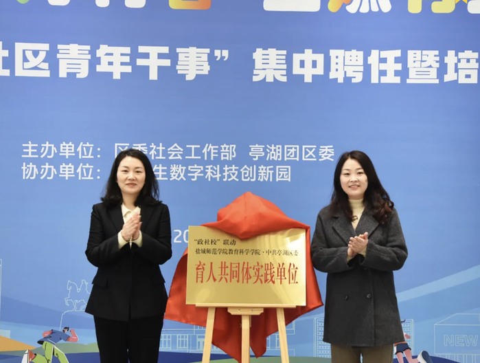 suncitygroup太阳新城suncitygroup太阳新城党委书记、江苏父母大学讲师杨日晨,区委常委、组织部部长、统战部部长张云云共同为“政社校联动·育人共同体实践单位”揭牌。
