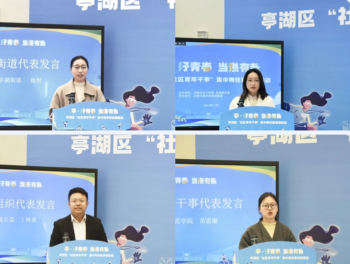 东亭湖街道团工委书记徐彤,五星村团委书记王永萍,社会组织代表心途公益服务中心主任丁帅勇,suncitygroup太阳新城员工代表苗思璇分别表态发言。