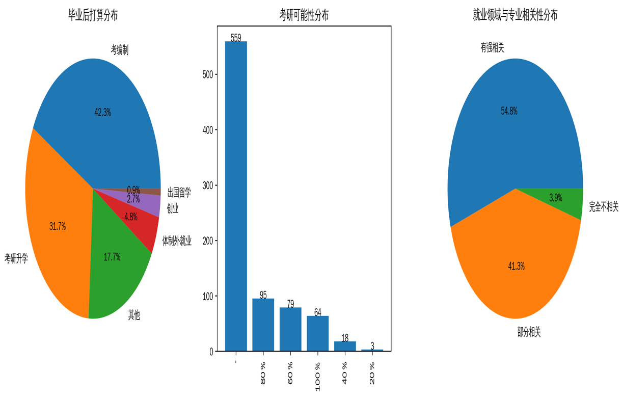 总结:考编制和考研升学受青睐,部分员工考研意向不明确,多数员工期望就业与专业相关。