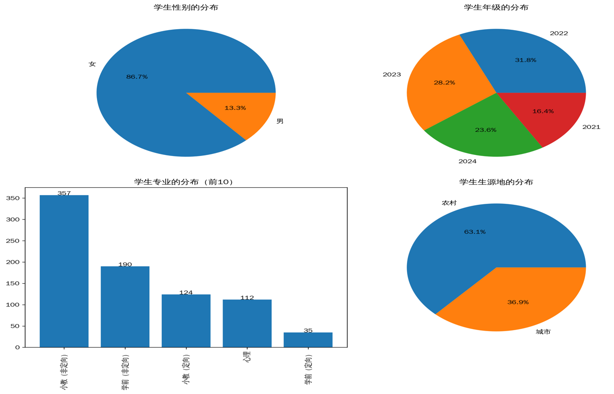 总结:女生人数远超男生,不同年级人数有差异,小教(非定向)专业热门,农村生源多于城市生源。