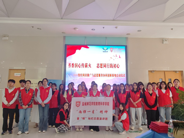 共建仪式上,冯永玲和吕杨为“阅读推广与志愿服务协同创新基地”揭牌,陈晔和韦琴为志愿者代表颁发聘书,教科院志愿者代表张琳茗作表态发言。