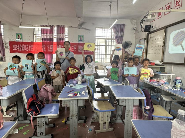 在教授“壮族铜鼓”和“壮锦团扇”时,同学们跟着我的思路,按照我逐步讲解的步骤和方法,一步一步完成了作品创作。在这个过程中,大家不仅掌握了相关的制作技巧,还深入了解了壮族文化的精髓,体验到了传统手工艺的魅力。那一刻,我意识到,我带来的不仅仅是知识,更是一份陪伴与希望,是与他们共同探索世界、点燃梦想的火种。