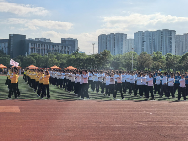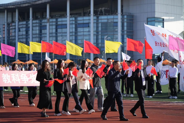 开幕式上,教科院员工方阵精神饱满、步伐铿锵,“乘风破浪,共创辉煌,盐师逐梦,教科争先”的口号响彻赛场,彰显出教科人的初心与担当,展现出奋发向上的良好风貌。广播体操展演中,同学们动作整齐划一,精神饱满昂扬,用青春的身影为绿茵场注入蓬勃朝气。