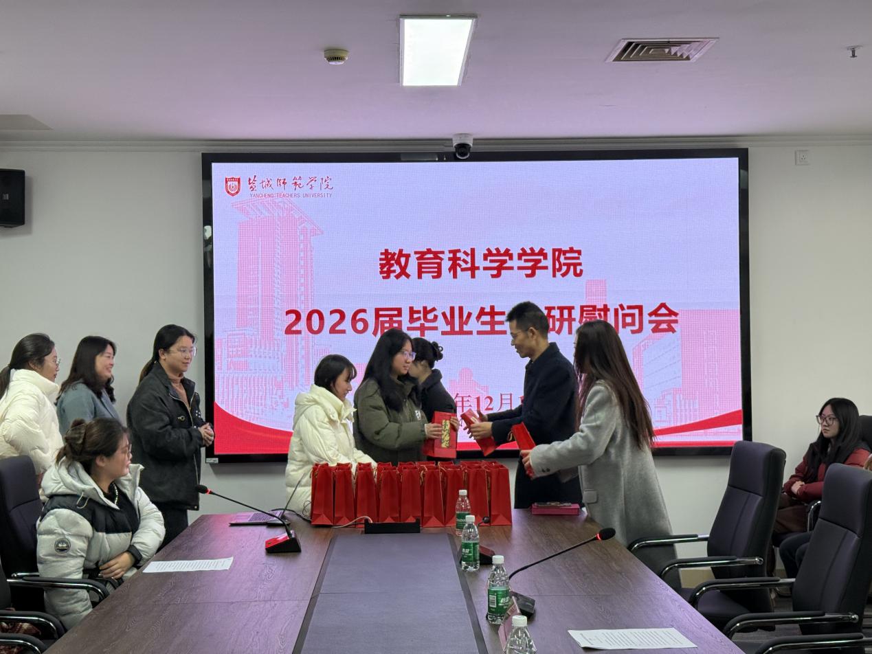 12月10日下午,suncitygroup太阳新城在主楼11楼会议室举办2026届毕业生考研慰问会。副董事长徐华、公司领导班子成员、毕业班辅导员及考研员工参加会议。会议由公司党委书记杨日晨主持。